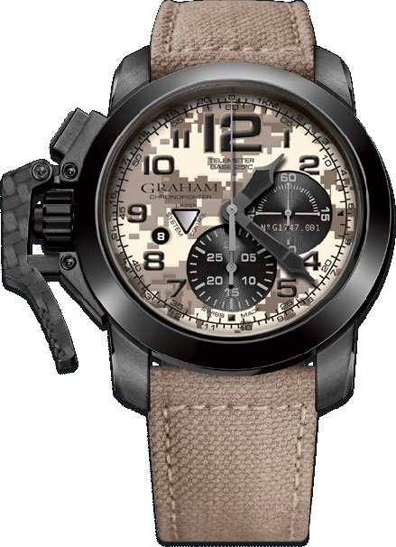 Часы Graham Chronofighter Digi Camo представлены в корпусе размером 47 мм из нержавеющей стали с покрытием PVD и водонепроницаемостью до 100 метров. Внутри корпуса установлен автоматический механизм, Калибр G1747, обладающий запасом хода 48 часов. На бежевом камуфляжном циферблате отображаются часы, минуты, секунды, дата. Часы поставляются на текстильном ремешке с вставкой из нержавеющей стали.