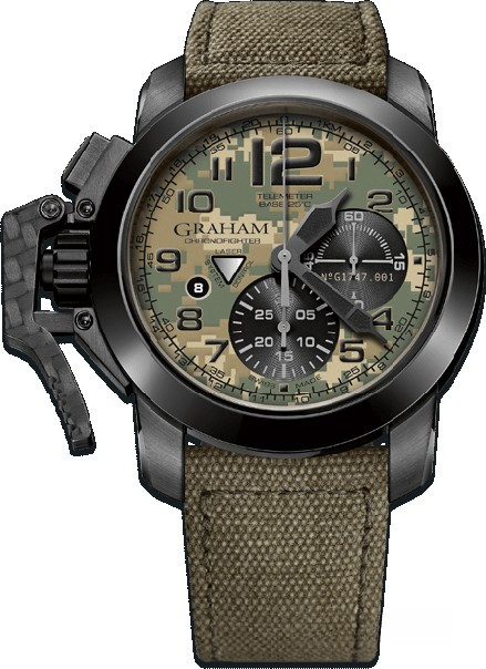Часы Graham Chronofighter Digi Camo представлены в корпусе размером 47 мм из нержавеющей стали с покрытием PVD и водонепроницаемостью до 100 метров. Внутри корпуса установлен автоматический механизм, Калибр G1747, обладающий запасом хода 48 часов. На зеленом камуфляжном циферблате отображаются часы, минуты, секунды, дата. Часы поставляются на текстильном ремешке с вставкой из нержавеющей стали.