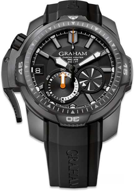 Часы Graham Chronofighter Prodive представлены в корпусе размером 45 мм из нержавеющей стали с покрытием DLC и водонепроницаемостью до 600 метров. Внутри корпуса установлен автоматический механизм, Калибр G1750, обладающий запасом хода 48 часов. На черном циферблате отображаются часы, минуты, секунды, дата. Часы поставляются на каучуковом ремешке с вставкой из нержавеющей стали.