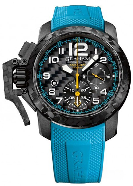 Часы Graham Chronofighter Superlight Carbon представлены в карбоновом корпусе диаметром 47 мм и водонепроницаемостью 100 метров. Внутри корпуса установлен автоматический механизм, Калибр G1747 с запасом хода 48 часов и функцией хронографа. На черном карбоновом циферблате отображаются часы, минуты, секунды, дата и накопители хронографа. Модель поставляется на голубом каучуковом ремешке с титановой вставкой.