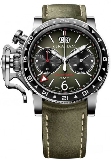Часы Graham Chronofighter Vintage GMT представлены в корпусе из нержавеющей стали диаметром 44 мм и водонепроницаемостью 100 метров. Внутри корпуса установлен автоматический механизм, Калибр G1733 с запасом хода 48 часов, функцией хронографа и второго часового пояса. На зеленом с черным циферблате отображаются часы, минуты, секунды, дата и накопители хронографа. Модель поставляется на оливковом кожаном ремешке с вставкой из нержавеющей стали.