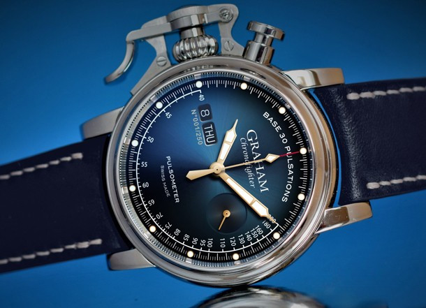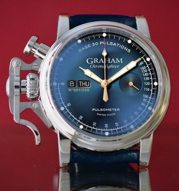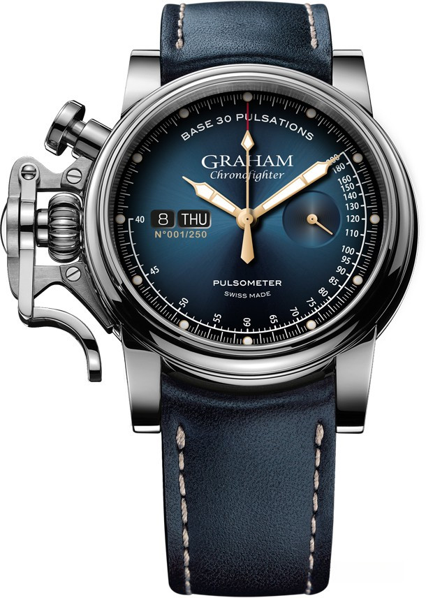 Часы Graham Chronofighter Vintage Pulsometer представлены в корпусе размером 44 мм из нержавеющей стали с водонепроницаемостью до 100 метров. Внутри корпуса установлен автоматический механизм, Калибр G1718, обладающий запасом хода 48 часов. На синем циферблате отображаются часы, минуты, секунды, дата день недели, пульсомер. Часы поставляются на кожаном ремешке с вставкой из нержавеющей стали. Серия ограничена 250 шт.