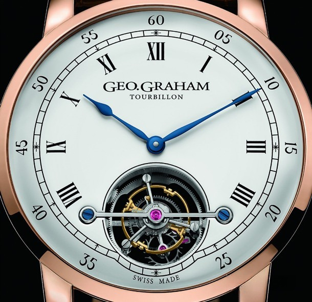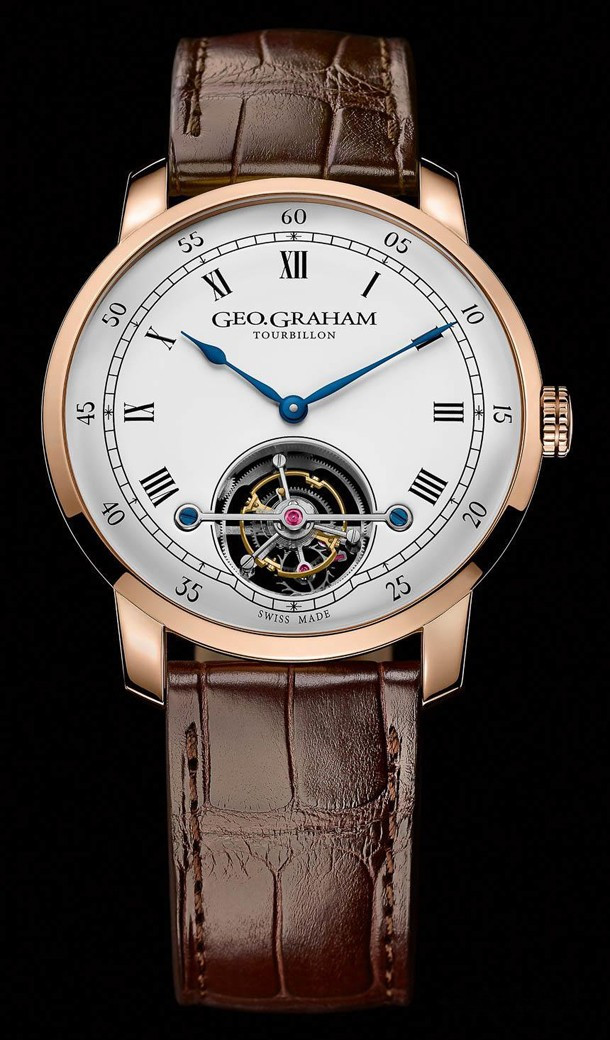 Часы с 60-секундным турбийоном в качестве индикатора секунд и индикацией времени с часовой и минутной стрелками обладают размером 40 х 9.85 мм и изготовлены из розового золота 18к. Циферблат Geo.Graham Tourbillon имеет внутреннюю шкалу с римскими цифрами, часовыми маркерами, и минутную шкалу с арабскими цифрами-маркерами. Турбийон традиционного стиля имеет плоский мост и виден сквозь заднюю часть корпуса. Часовой механизм модели Geo.Graham Tourbillon G1796 работает с частотой 3 Гц (21 600 пк/час) и имеет запас хода 72 часа (три дня). Имея водонепроницаемость до 50 метров и соответствующий часам вручную сшитый коричневый ремешок из кожи аллигатора, Geo.Graham Tourbillon приятно сидят на запястье и своим шикарным добротным видом не оставят равнодушным никого. Выпуск ограниченной серии Geo.Graham Tourbillon реф. 2GGCP.W01A составит 100 единиц.