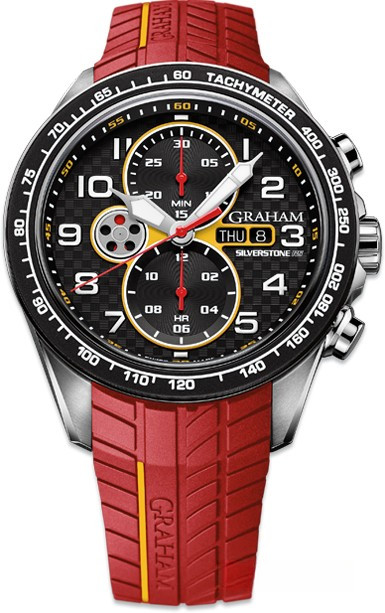Часы Graham Silverstone RS Racing представлены в корпусе из нержавеющей стали диаметром 46 мм и водонепроницаемостью 100 метров. Внутри корпуса установлен автоматический механизм, Калибр G1749 с запасом хода 48 часов и функцией хронографа. На черном гильошированном циферблате отображаются часы, минуты, секунды, дата, день недели, тахиметр и накопители хронографа. Модель поставляется на красном каучуковом ремешке с вставкой из нержавеющей стали.
