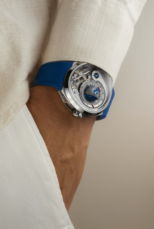 Часы Greubel Forsey Convexe GMT Balancier представлены в корпусе из титана размером 43.5 х 46.5 х 17.3 мм водонепроницаемостью 100 метров. Внутри корпуса установлен механизм с ручным заводом, обладающий запасом хода 72 часа. На серебристом циферблате отображаются часы, минуты, секунды, индикатор день/ночь, летнее/зимнее время. Часы поставляются на каучуковом ремешке с титановой застежкой. Серия огрничена - 22 шт.