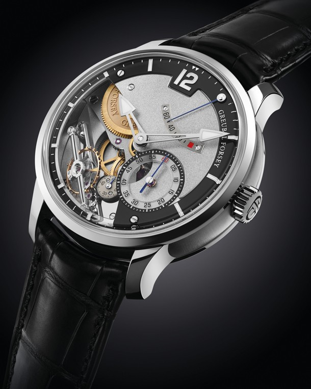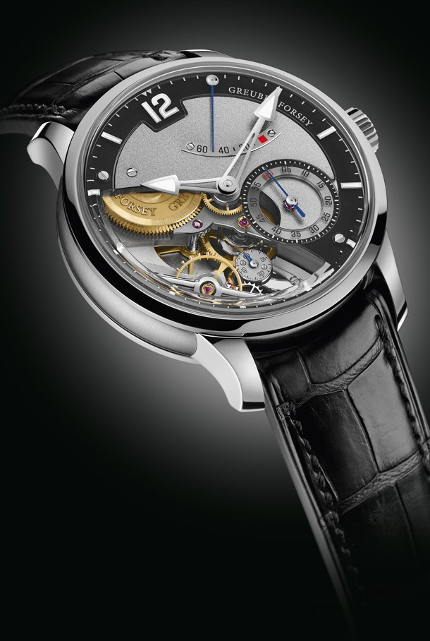 Это первые часы Greubel Forsey с замирающей секундной стрелкой. Данное нововведение значительно облегчает считывание и настройку показаний. Оснастившее часы устройство блокировки баланса и перезапуска секундной стрелки активируется при выдвижении заводной головки. Данный модуль с сердечником и молоточком виден через прозрачную заднюю крышку. Спусковой механизм и наклон баланса 30° способствует бесперебойному вращению в стационарном положении. Это позволяет достичь оптимальной точности хода, безупречной работы балансового колеса и значительно усовершенствовать хронометрические свойства часов. Совокупность данных элементов максимально улучшает технические характеристики модели. Эстетика часов в полной мере соответствует техническим стандартам Greubel Forsey. Большое окошко на циферблате дает возможность по достоинству оценить великолепие и совершенство часового механизма. Сапфировое стекло нестандартной формы подчеркивает изящество очертаний этой новой модели. С обратной стороны часов виден механизм остановки/перезапуска, отдельные элементы оформлены микрогравировкой с перечнем ключевых ценностей, которые Робер Гребель (Robert Greubel) и Стивен Форси (Stephen Forsey) вкладывают в свои творения. Данная модель из белого золота выпущена ограниченной серией из 33 экземпляров.