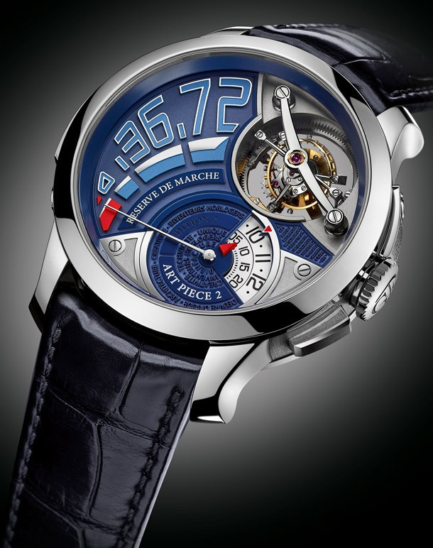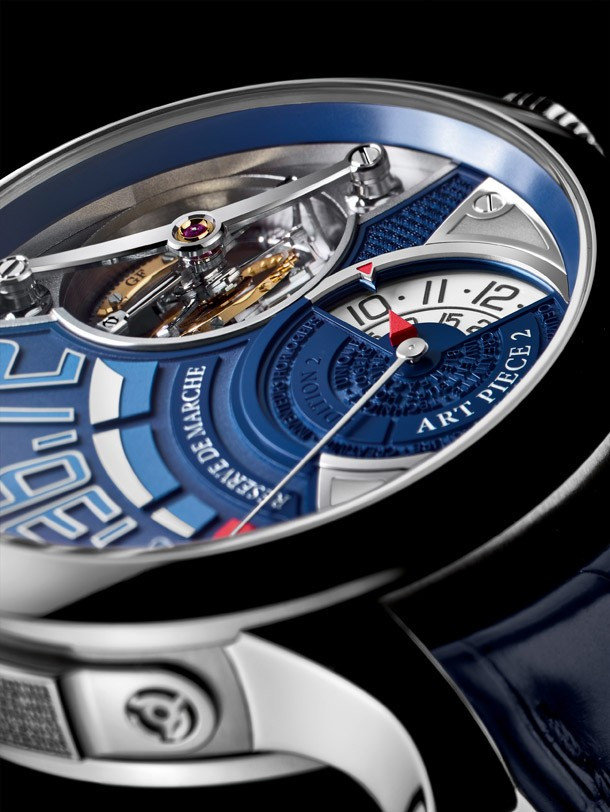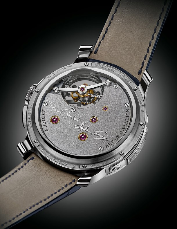 Часы Art Piece 2 – Edition 2 с особой решительностью раздвигают пределы творческих возможностей. Эта первая модель Art Piece не имеет оптической системы (а значит, и микроскульптуры или нано-гравюры) – роль движущейся скульптуры в ней играет двойной турбийон с углом наклона 30°. Указание времени отходит на второй план: для получения доступа к индикации часов и минут необходимо нажать кнопку, управляющую бистабильным механизмом. Первостепенное значение приобретает информация о запасе хода, что полностью меняет характер наших взаимоотношений со временем: мы интересуемся не тем, «который час», а тем «сколько времени еще осталось». Неуловимое перемещение акцентов определяет принадлежность изделия к жанру memento mori. Эта модель с подписью Робера Гребеля (Robert Greubel) и Стивена Форси (Stephen Forsey) будет выпущена ограниченной серией из нескольких экземпляров в год.