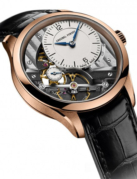 Хотя это действительно самые простые часы Greubel Forsey на сегодняшний день, они не являются традиционными. На создание часов ушло шесть лет, в основном – на новую систему баланса, которая включает крупное колесо диаметром 12.6 мм и пружину, работающую на частоте 18 000 пк/час. Колесо и мост, на котором оно крепится, отполированы и невероятно красивы. Циферблат, схожий с моделью 24 Hours Vision, демонстрирует маркера, выгравированные на нем, а затем эмалированные с обжиганием в печи. В центре внимания бриллиантовая отделка и снятые фаски. За циферблатом можно увидеть палету с прекрасными широкими женевскими волнами. На задней части корпуса присутствует еще более удивительная отделка. Мосты, выполненные из нейзильбера, матированные и зернистые, с отполированными фасками; широкие полированные внутренние углы; храповик, состоящий из концентрических кругов, с колесом с отполированными зубьями со снятыми фасками; а также общая полировка. Стрелки выполнены из стали и золота. Калибр GFS1, результат 6-летней разработки, можно считать одним из наиболее тонко и современно отделанных часовых механизмов с одной лишь часовой индикацией. Размеры часов составляют 41.4 мм в диаметре, 11.7 мм в толщину, и весьма комфортно сидят на запястье.