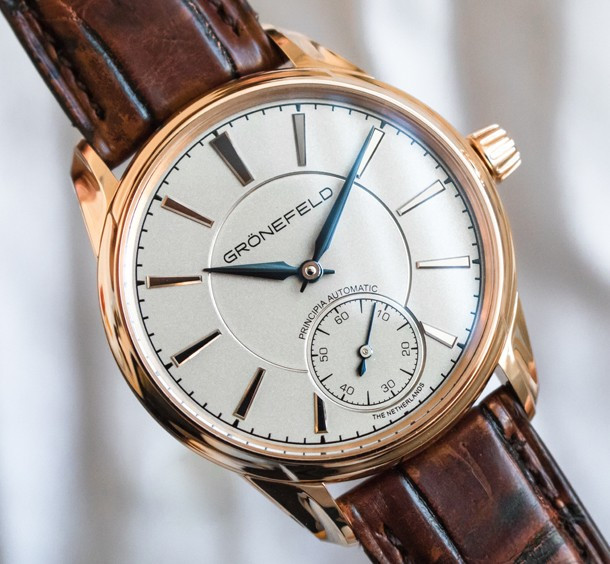 Часы Gronefeld 1941 Principia представлены в корпусе из розового золота 18к размером 39.5 х 10.5 мм. Внутри корпуса установлен автоматический механизм, Калибр 1941 Principia, обладающий запасом хода 56 часов. На серебристом циферблате отображаются часы, минуты и секунды. Часы поставляются на кожаном ремешке с вставкой из розового золота 18к. Водонепроницаемость корпуса составляет 30 метров.