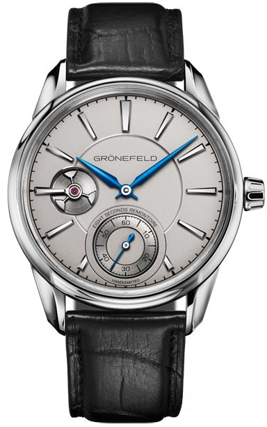 Часы Groenefeld 1941 Remontoire представлены в корпусе из белого золота 18к размером 39.5 х 10.5 мм и водонепроницаемостью 30 метров. Внутри корпуса установлен автоматический механизм с запасом хода 35 часов. На серебристом циферблате отображаются часы, минуты, секунды. Часы поставляются на ремешке из кожи аллигатора с вставкой из белого золота 18к.