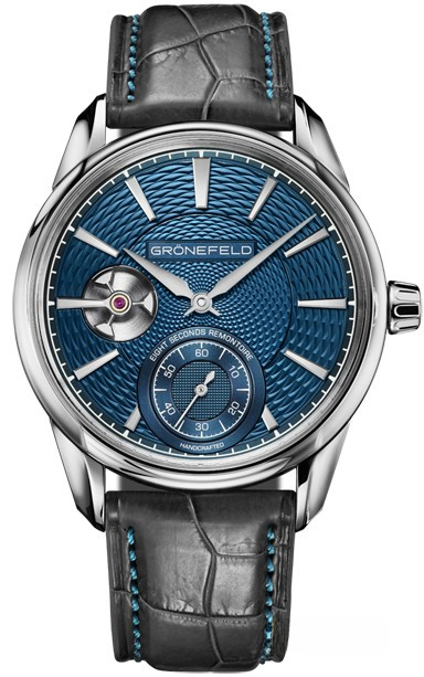Часы Groenefeld Bespoke 1941 Remontoire представлены в корпусе из белого золота 18к размером 39.5 х 10.5 мм и водонепроницаемостью 30 метров. Внутри корпуса установлен автоматический механизм с запасом хода 35 часов. На синем гильошированном циферблате отображаются часы, минуты, секунды. Часы поставляются на ремешке из кожи аллигатора с вставкой из белого золота 18к.