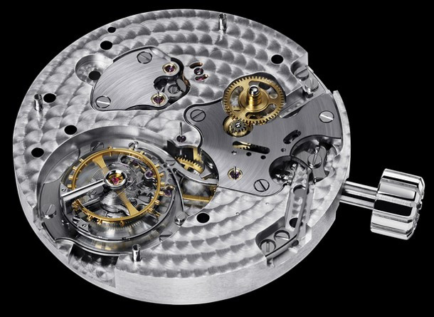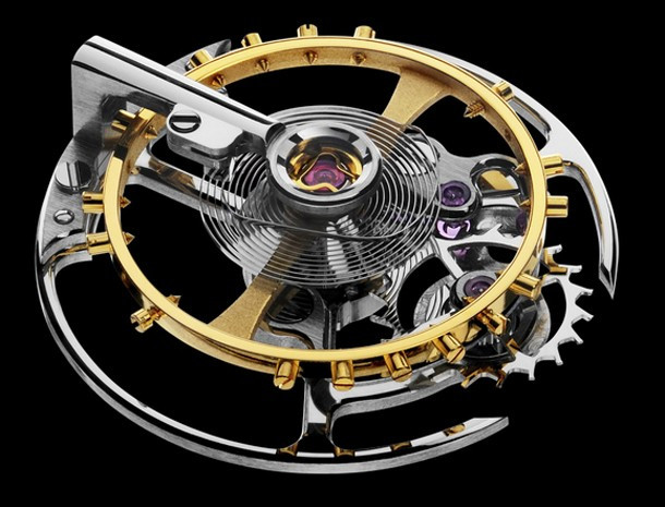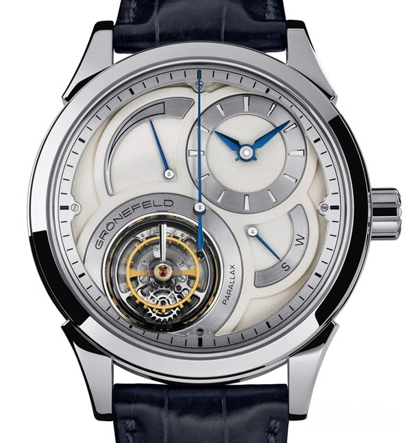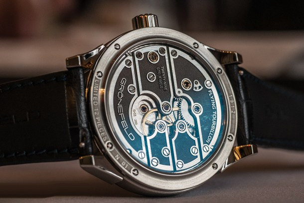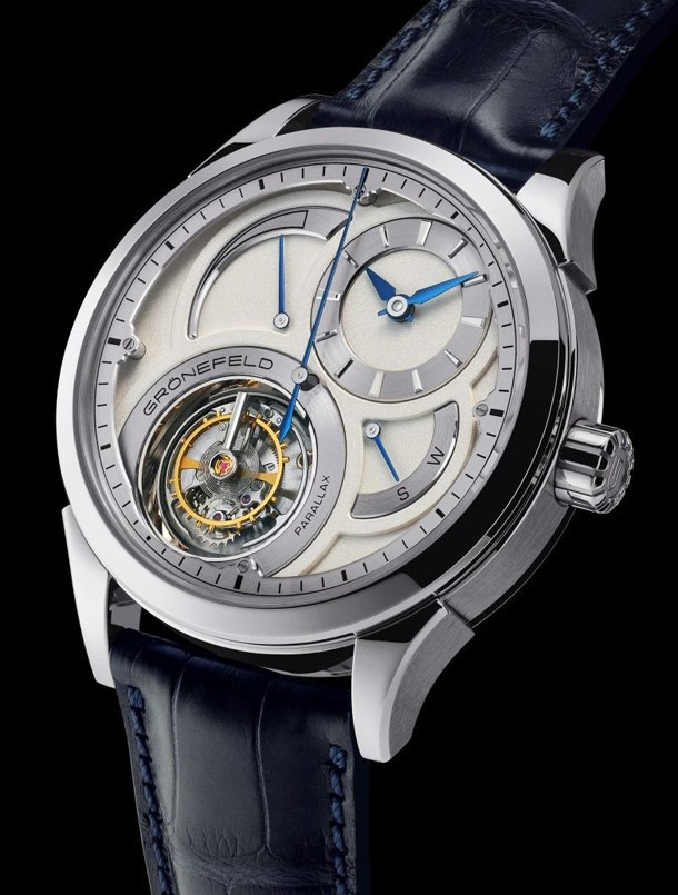 Parallax Tourbillon обладает узнаваемым стилем Grönefeld не только на циферблате, но также и в обработке механизма, который представляет собой собственно разработанный калибр с парящим турбийоном. Калибр G-03 имеет заводную головку (push-to-wind/push-to-set) и индикатор запаса хода. Этот механизм продолжает тему из One Hertz с параллельными мостами, декорированными гранулированных и полированных поверхностей для создания большего контраста. Всю эту красоту можно увидеть сквозь сапфировую заднюю крышку. Но звезда шоу здесь - парящий турбийон. Любопытно, что секундная стрелка не связана с 60-ти секундным вращением турбийона. Корпус Parallax Tourbillon представлен в корпусе из нержавеющей стали размером 43 мм. Доказательство эксклюзивности этих исключительных часов, ограниченный тираж модели из нержавеющей стали в количестве 12 штук.