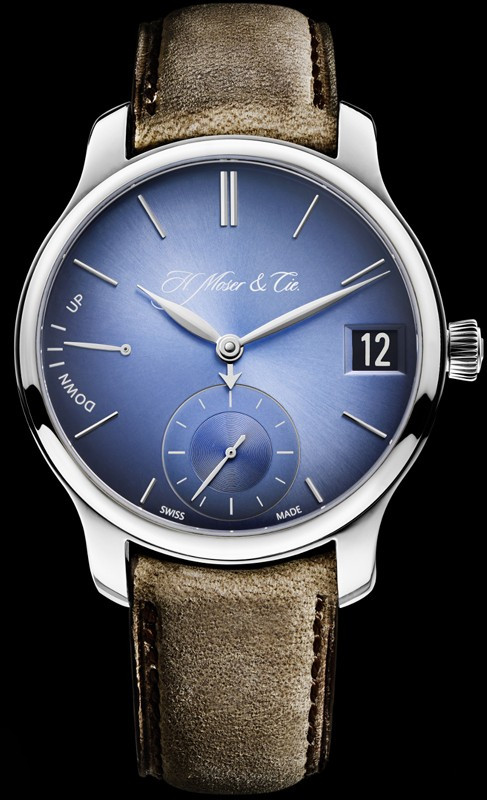 H. Moser & Cie Endeavour Perpetual Calendar Funky Blue от H. Moser & Cie – вечный календарь с круглым корпусом, изготовленным из белого золота 18к, состоящим из трех компонентов, диаметром 40,80 мм, толщиной 11,10 мм. Модель оснащена мануфактурным механизмом с ручным заводом H. Moser & Cie HMC 341, двумя заводными барабанами, семидневным запасом хода, модулем регулятора хода со спиралью Original Straumann Hairspring®, с функциями индикации часов, минут, секунд (посредством соответствующих центральных стрелок), даты (посредством соответствующего цифрового указателя в апертуре, расположенной на 3 часах), месяца (посредством короткой центральной стрелки, на часовой шкале циферблата, где каждый часовой индекс соответствует порядковому номеру месяца), запаса хода (посредством аналогового указателя, расположенного на 9 часах) и високосного года (соответствующий указатель расположен на задней стороне механизма и просматривается сквозь сапфировое стекло на задней крышке корпуса). Часы с синим циферблатом комплектуются коричневым кожаным ремешком с золотой застежкой.
