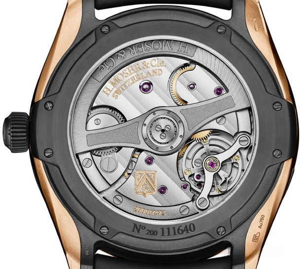 Каучуковый ремешок и водонепроницаемый до 120 м корпус делают эти часы безупречным аксессуаром на каждый день, разделяющим стиль и индивидуальность марки H. Moser & Cie. Каучуковый ремешок – новый материал в коллекции H. Moser & Cie., следствие естественного прогресса марки. Его дизайн гармонирует с отделкой корпуса и циферблата этих надежных и стильных часов. Модель Pioneer Centre Seconds с корпусом диаметром 42.8 мм сохраняет сбалансированные, гармоничные пропорции. Модульный дизайн составного корпуса свидетельствует о высоком уровне технических инноваций, позволяющем компании H. Moser сочетать различные материалы, цвета и покрытия. Для модели Pioneer Centre Seconds компанией H. Moser & Cie. был разработан новый часовой механизм с автоматическим подзаводом. Оснащенные системой завода со стопорной собачкой, часы имеют гарантированный запас хода не менее трех дней. Калибр HMC 200, с классической отделкой и гильоше «Полосы Moser», имеет покрытие черного цвета, подчеркивающее спортивный характер модели, и элементы из красного золота, гармонирующие с отделкой корпуса.
