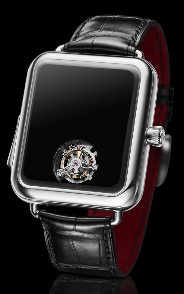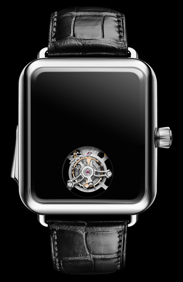 Часы H. Moser & Cie Swiss Alp Watch Concept Black представлены в корпусе из платины 950 размером 45.8 x 39.8 х 11 мм. Внутри корпуса установлен механизм с ручным заводом, Калибр HMC 901, обладающий запасом хода 87 часов. На черном циферблате расположен турбийон. Часы комплектуются ремешком из кожи аллигатора с вставкой из платины 950. Часы и минуты по запросу. Минутный репетир отстукивает часы, четверти и минуты. Часы выпущены в единственном экземпляре.