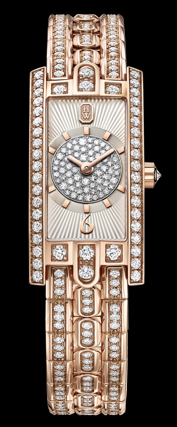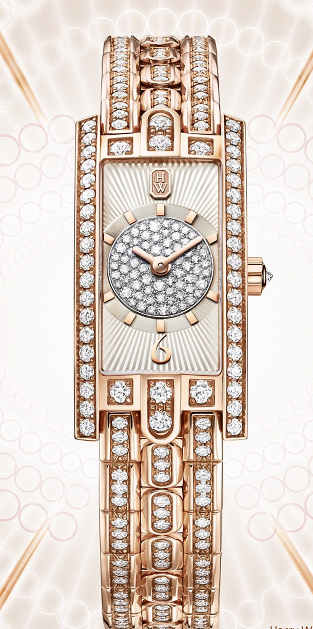 Миниатюрная версия легендарных часов Avenue C, модель Avenue C Mini Art Déco сконцентрировала в себе все сияние и энергию бриллиантов. Ее хрупкие пропорции выгодно подчеркивают изысканные звенья браслета. Для Гарри Уинстона бриллианты были неотъемлемой частью его жизни. Он подарил им свободу самовыражения. Так и в этой модели специальная плавная закрепка бриллиантов, разработанная Домом, не затмевает их красоты, а позволяет им окутывать тело женщины, словно драгоценная ткань. Модель Avenue C Mini Art Déco является достойной наследницей ювелирных творений, которые не просто украшают, а ласкают и согревают кожу. Гибкий браслет из розового золота 750 пробы напоминает настоящую сверкающую реку из 212 бриллиантов классической огранки общим весом 2,18 карата. Две арки с бриллиантами в положении «12» и «6» часов украшены крупными камнями, которые обращают на себя внимание и придают особую выразительность модели. Геометрическая и точно выверенная композиция часов нарушается современным дизайном и отделкой циферблата, на котором гильоширный узор «солнечные лучи» весело играет с полированными и матовыми поверхностями, а часовая шкала со спиралевидным узором, в центре которой находится паве, выполненное в технике «снег», озаряет часы своим сиянием.