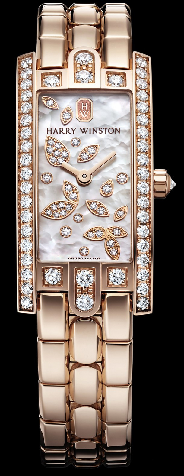 Полные нежности часы Avenue C Mini Lily Cluster – это настоящая ода грациозной природе. Цветочные и растительные мотивы всегда широко использовались в ювелирном искусстве. Именно поэтому невероятно красивые украшения из коллекции Cluster, создаваемые Harry Winston с 1940-х годов, вдохновлены графичностью цветов и листьев, а также их удивительной плавностью и гибкостью. Выпущенная в 2011 году коллекция Lily Cluster предлагает новую современную интерпретацию формы лепестков и распустившихся цветов в своих многочисленных виртуозно выполненных украшениях. Часы Avenue C Mini Lily Cluster прекрасно передают дух коллекции и заставляют ярко сверкать бриллианты, образующие изысканные узоры Cluster на циферблате из белоснежного перламутра. Бриллианты различных видов огранки (классическая, груша или маркиз) образуют на нем поэтическую композицию, словно бы созданную самой природой. Контраст, создаваемый между роскошным циферблатом и корпусом с браслетом простых геометрических линий, поражает своей красотой. Связующей нитью между этими столь разными стилями служит сияющий перламутр, который отражается в 47 бриллиантах классической огранки, украшающих часовой корпус.