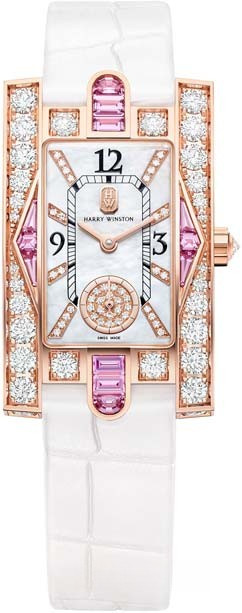 Часы Avenue Classic Aurora имеют рхитектурный стиль, с его суженными багетами и геометрическими элементами, напоминающими колонны в зданиях в стиле арт-деко. В качестве индексов времени используются белые бриллианты, сразу по 4 штуки в ряд. Маленький жемчужный циферблат украшен бриллиантовым паве, логотипом и надписью Harry Winston. Новинка представлена в корпусе из розового золота 18к, а также с акцентами из розовых сапфиров общим весом 0.79 карат. Общий вес бриллиантов – 3.47 карата. Механизм кварцевый.