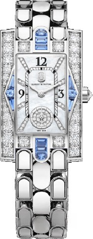 Часы Avenue Classic Aurora имеют архитектурный стиль, с его суженными багетами и геометрическими элементами, напоминающими колонны в зданиях в стиле арт-деко. В качестве индексов времени используются белые бриллианты, сразу по 4 штуки в ряд. Маленький жемчужный циферблат украшен бриллиантовым паве, логотипом и надписью Harry Winston. Новинка представлена в корпусе из белого золота 18к, а также с акцентами из синих сапфиров общим весом 0.79 карат. Общий вес бриллиантов – 3.47 карата. Механизм кварцевый.