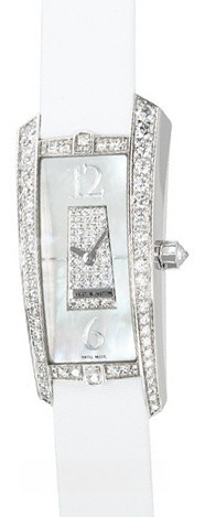 Часы Harry Winston Avenue Traffic размером 26 x 46.1 мм представлены в корпусе из белого золота 18к с водонепроницаемостью до 30 метров. Корпус часов инкрустирован белыми бриллиантами. Белый жемчужный циферблат украшают белые бриллианты. Кварцевый механизм поддерживает функции индикации часов и минут. Часы комплектуются сатиновым ремешком с золотой вставкой.