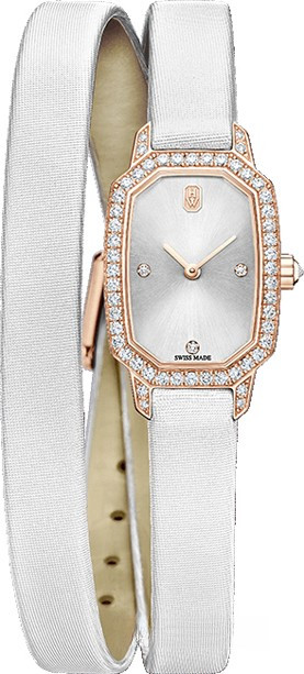 Часы Harry Winston Emerald представлены в корпусе из розового золота 18к размером 24 х 17.75 мм и водонепроницаемостью до 30 метров. Внутри корпуса установлен кварцевый механизм, Калибр HW1040. На серебристом циферблате с 3-мя белыми бриллиантами отображаются часы и минуты. Часы комплектуются белым сатиновым ремешком с вставкой из розового золота 18к. Корпус инкрустирован белыми бриллиантами.