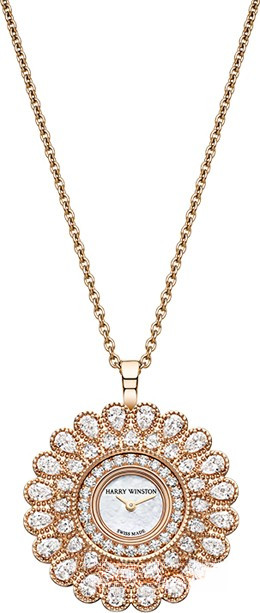 Часы Harry Winston Marquise Time выпущены в корпусе из розового золота 18к размером 36 мм и водонепроницаемостью 30 м. Внутри корпуса установлен кварцевый механизм, Калибр HW1051. На белом жемчужном циферблате отображаются часы, минуты. Часы комплектуются цепочкой из розового золота 18к. Корпус инкрустирован белыми бриллиантами.