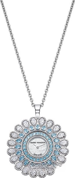 Часы Harry Winston Marquise Time выпущены в корпусе из белого золота 18к размером 36 мм и водонепроницаемостью 30 м. Внутри корпуса установлен кварцевый механизм, Калибр HW1051. На белом жемчужном циферблате отображаются часы, минуты. Часы комплектуются цепочкой из белого золота 18к. Корпус инкрустирован белыми бриллиантами и голубыми аквамаринами.