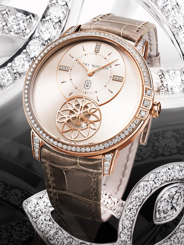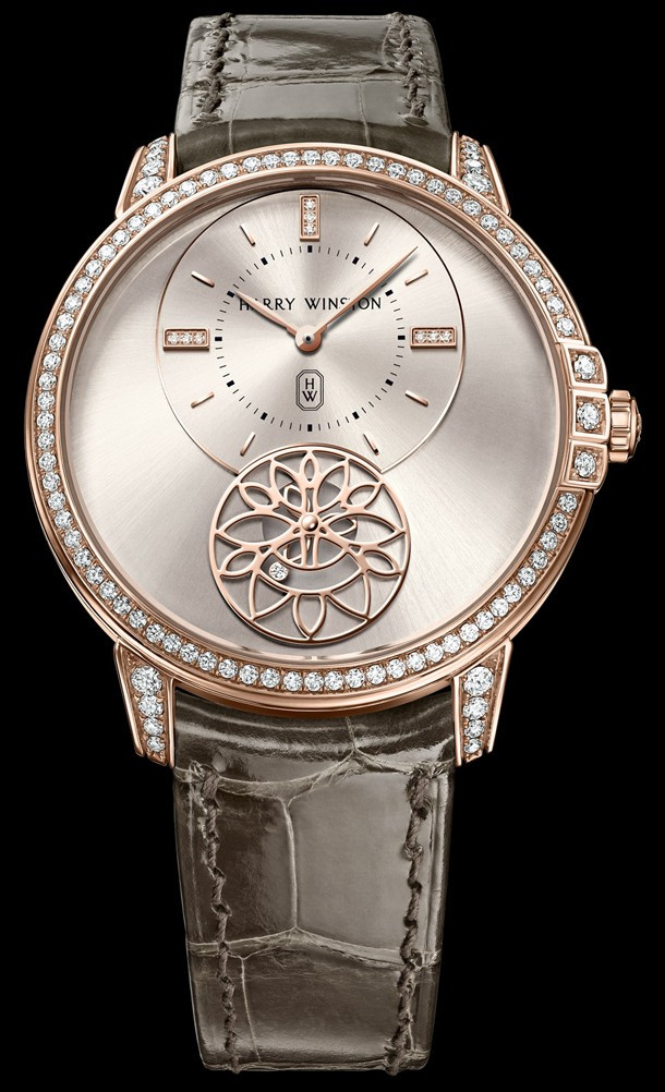 Модель Midnight Diamond Second 39mm преисполнена необыкновенной поэтичности. Источником вдохновения для создания этих часов послужило богатейшее наследие компании Harry Winston. На матовом циферблате цвета розового шампанского эффектно выделяется смещенный от центра индикатор часов и минут в положении «12 часов», который выполнен в довольно сдержанном стиле, характерном для коллекции Midnight. Он украшен элегантными полированными метками из золота, три из которых инкрустированы бриллиантами. Под восьмиугольником с логотипом марки, в положении «6 часов», разместился индикатор с малой секундной стрелкой, украшенный мотивом ювелирной коллекции Lily Cluster. Коллекция Lily Cluster, напоминающая грациозно раскрывающийся цветок, посвящена знаменитой технике закрепки камней Cluster, которая была разработана ювелирами Harry Winston, чтобы лучше передавать очарование природы. На циферблате модели Midnight Diamond Second 39mm ажурный цветок распускается в темп уходящим секундам, которые указываются тремя бриллиантами, следующими друг за другом так, чтобы один из них всегда оставался виден в окошке индикатора. Согласно неизменной традиции компании Harry Winston, огранка и красота камней, украшающих ободок и ушки крепления ремешка, подчеркивается безупречной закрепкой, которая, как всегда, практически незаметна. Midnight Diamond Second 39mm – это первые механические часы с малой секундной стрелкой в женской коллекции Midnight. Их механизм с автоматическим заводом виден сквозь прозрачную заднюю крышку. Дополняет картину ремешок из блестящей крокодиловой кожи серо-коричневого цвета.