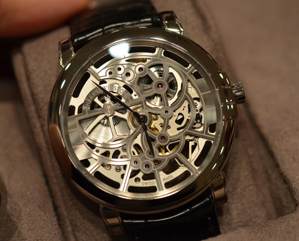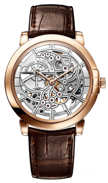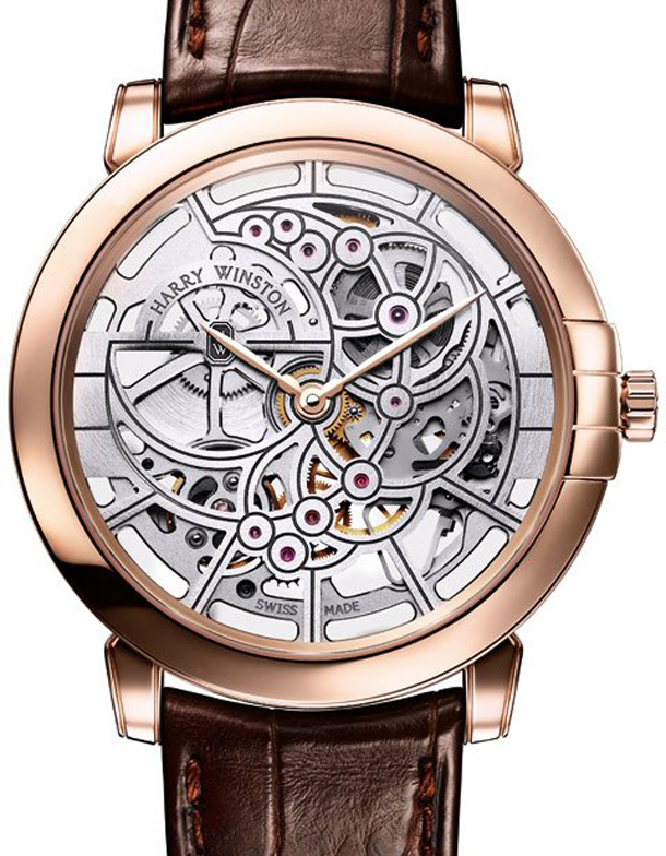 Часы Harry Winston Midnight Skeleton выпущены в корпусе из розового золота 18к, размером 42 мм и водонепроницаемостью 30 м. Внутри корпуса установлен автоматический механизм, Калибр HW3001. На серебристом циферблате отображаются часы, минуты. Запас хода 72 часа. Часы комплектуются ремешком из кожи аллигатора с вставкой из розового золота 18к.