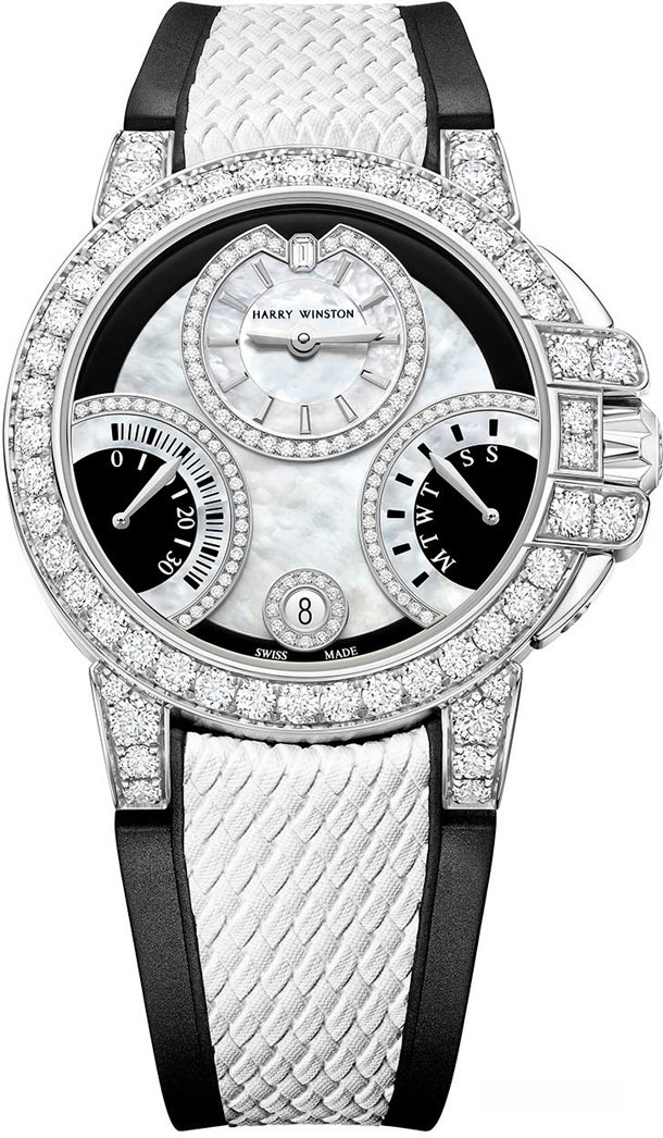 Ocean Bi-Retrograde 36mm, одна из самых классических моделей компании Harry Winston, обращает на себя внимание своим графическим дизайном: смещенный от центра индикатор часов и минут и две ретроградные функции придают циферблату особый динамизм. Эта новая восхитительная версия предназначена для женщин, которые отдают предпочтение технически безупречным механизмам с эффектной отделкой. Часы Ocean Bi-Retrograde 36 mm завораживают своим дизайном, преисполненным особой энергии и гармонии. Корпус модели оснащен заводной коронкой нового дизайна, декоративными кнопками со скошенными кромками, удлиненными ушками крепления ремешка и арками, чьи линии стали еще более тонкими и строгими. Сверкающие на корпусе и ободке бриллианты высочайшего качества и безупречной огранки свидетельствуют о ювелирном мастерстве и богатейшем наследии Harry Winston. Искусные ювелиры марки применили все свои умения и талант, чтобы закрепка камней была как можно менее заметной. Ярко сияющие на циферблате бриллианты заставляют женские сердца трепетать от восторга.