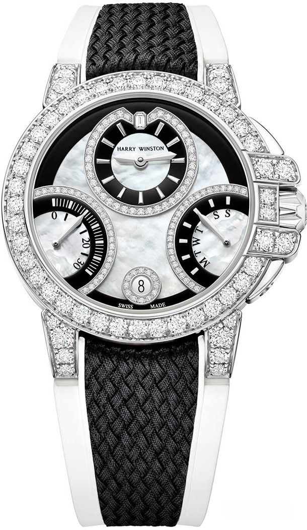 Ocean Bi-Retrograde 36mm, одна из самых классических моделей компании Harry Winston, обращает на себя внимание своим графическим дизайном: смещенный от центра индикатор часов и минут и две ретроградные функции придают циферблату особый динамизм. Эта новая восхитительная версия предназначена для женщин, которые отдают предпочтение технически безупречным механизмам с эффектной отделкой. Часы Ocean Bi-Retrograde 36 mm завораживают своим дизайном, преисполненным особой энергии и гармонии. Корпус модели оснащен заводной коронкой нового дизайна, декоративными кнопками со скошенными кромками, удлиненными ушками крепления ремешка и арками, чьи линии стали еще более тонкими и строгими. Сверкающие на корпусе и ободке бриллианты высочайшего качества и безупречной огранки свидетельствуют о ювелирном мастерстве и богатейшем наследии Harry Winston. Искусные ювелиры марки применили все свои умения и талант, чтобы закрепка камней была как можно менее заметной. Ярко сияющие на циферблате бриллианты заставляют женские сердца трепетать от восторга.