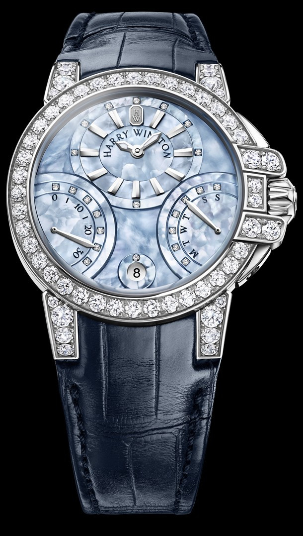 Ocean Bi-Retrograde 36mm, одна из самых классических моделей компании Harry Winston, обращает на себя внимание своим графическим дизайном: смещенный от центра индикатор часов и минут и две ретроградные функции придают циферблату особый динамизм. Эта новая восхитительная версия предназначена для женщин, которые отдают предпочтение технически безупречным механизмам с эффектной отделкой. Часы Ocean Bi-Retrograde 36mm завораживают своим дизайном, преисполненным особой энергии и гармонии. Слегка приподнятые перламутровые счетчики, украшенные бриллиантами, создают многоуровневый эффект, превращая циферблат загадочного серо-голубого цвета в драгоценный архитектурный ансамбль. Корпус модели оснащен заводной коронкой нового дизайна, декоративными кнопками со скошенными кромками, удлиненными ушками крепления ремешка и арками, чьи линии стали еще более тонкими и строгими. Сверкающие на корпусе и ободке бриллианты высочайшего качества и безупречной огранки свидетельствуют о ювелирном мастерстве и богатейшем наследии Harry Winston. Искусные ювелиры марки применили все свои умения и талант, чтобы закрепка