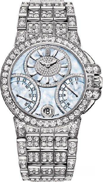 Ocean Bi-Retrograde 36mm, одна из самых классических моделей компании Harry Winston, обращает на себя внимание своим графическим дизайном: смещенный от центра индикатор часов и минут и две ретроградные функции придают циферблату особый динамизм. Эта новая восхитительная версия предназначена для женщин, которые отдают предпочтение технически безупречным механизмам с эффектной отделкой. Часы Ocean Bi-Retrograde 36mm завораживают своим дизайном, преисполненным особой энергии и гармонии. Слегка приподнятые перламутровые счетчики, украшенные бриллиантами, создают многоуровневый эффект, превращая циферблат загадочного голубого цвета в драгоценный архитектурный ансамбль. Корпус модели оснащен заводной коронкой нового дизайна, декоративными кнопками со скошенными кромками, удлиненными ушками крепления ремешка и арками, чьи линии стали еще более тонкими и строгими. Сверкающие на корпусе и ободке бриллианты высочайшего качества и безупречной огранки свидетельствуют о ювелирном мастерстве и богатейшем наследии Harry Winston. Искусные ювелиры марки применили все свои умения и талант, чтобы закрепка камней была как можно менее заметной. Ярко сияющие на циферблате бриллианты заставляют женские сердца трепетать от восторга.
