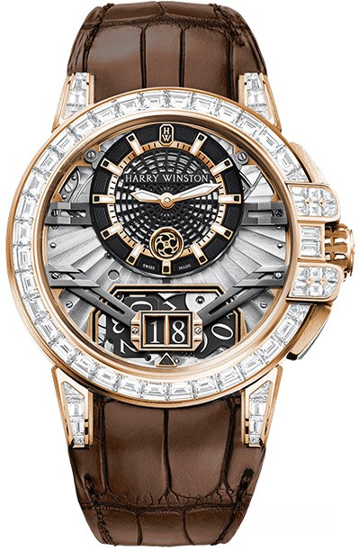 Часы Harry Winston Ocean Big Date Automatic 42mm представлены в корпусе из розового золота 18к диаметром 42 мм и водонепроницаемостью до 100 метров. Внутри корпуса установлен автоматический механизм, Калибр HW3206. На черном скелетированном циферблате отображаются часы, минуты и дата. Часы комплектуются ремешком из кожи аллигатора с вставкой из розового золота 18к. Часы инкрустированы белыми багетными бриллиантами.