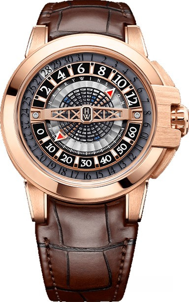 Часы Harry Winston Ocean Retrograde Automatic 42mm выпущены в корпусе из розового золота 18к, размером 42.2 мм и водонепроницаемостью 100 м. Внутри корпуса установлен автоматический Калибр HW3306. На сером скелетированном циферблате отображаются часы, минуты, дата. Часы комплектуются ремешком из кожи аллигатора с вставкой из розового золота 18к.
