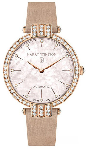 Часы Harry Winston Premier Automatic 36 mm выпущены в корпусе из розового золота 18к, размером 36 мм и водонепроницаемостью 30 м. Внутри корпуса установлен автоматический механизм, Калибр HW5301. На розовом жемчужном с 12-ю белыми бриллиантами циферблате отображаются часы, минуты. Часы комплектуются сатиновым ремешком с вставкой из розового золота 18к. Корпус инкрустирован белыми бриллиантами.