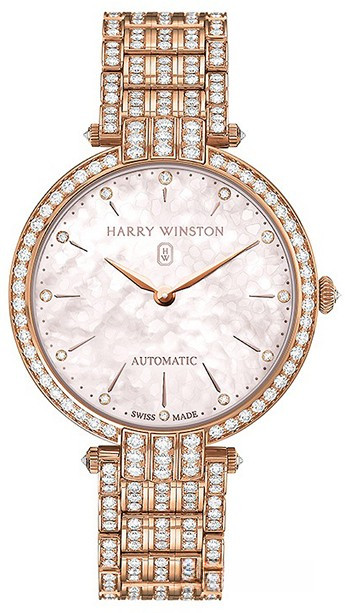 Часы Harry Winston Premier Automatic 36 mm выпущены в корпусе из розового золота 18к, размером 36 мм и водонепроницаемостью 30 м. Внутри корпуса установлен автоматический механизм, Калибр HW5301. На розовом жемчужном с 12-ю белыми бриллиантами циферблате отображаются часы, минуты. Часы комплектуются браслетом из розового золота 18к, инкрустированным белыми бриллиантами. Корпус инкрустирован белыми бриллиантами.