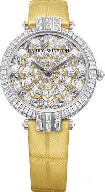 Часы Harry Winston Premier Automatic 36 mm выпущены в корпусе из белого золота 18к, размером 36 мм и водонепроницаемостью 30 м. Внутри корпуса установлен автоматический механизм, Калибр HW2008. На циферблате из белых багетных бриллиантов и желтых багетных сапфиров отображаются часы, минуты. Часы комплектуются ремешком из кожи аллигатора с вставкой из белого золота 18к. Корпус инкрустирован белыми багетными бриллиантами.