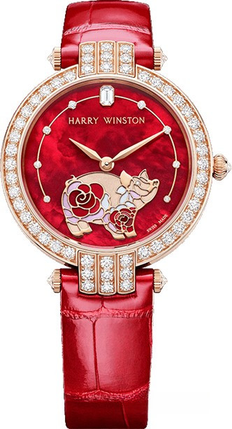 Часы Harry Winston Premier Chinese New Year Automatic 36 mm выпущены в корпусе из розового золота 18к, размером 36 мм и водонепроницаемостью 30 м. Внутри корпуса установлен автоматический механизм, Калибр HW2008. На красном жемчужном циферблате с белыми бриллиантами и эмалью отображаются часы, минуты. Часы комплектуются ремешком из кожи аллигатора с вставкой из розового золота 18к. Корпус инкрустирован белыми бриллиантами.
