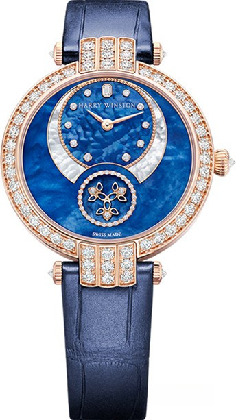 Часы Harry Winston Premier Diamond Second Automatic 36 mm выпущены в корпусе из розового золота 18к, размером 36 мм и водонепроницаемостью 30 м. Внутри корпуса установлен автоматический механизм, Калибр HW2201. На синем с белым жемчужным с белыми бриллиантами циферблате отображаются часы, минуты, секунды. Часы комплектуются ремешком из кожи аллигатора с вставкой из розового золота 18к. Корпус инкрустирован белыми бриллиантами.