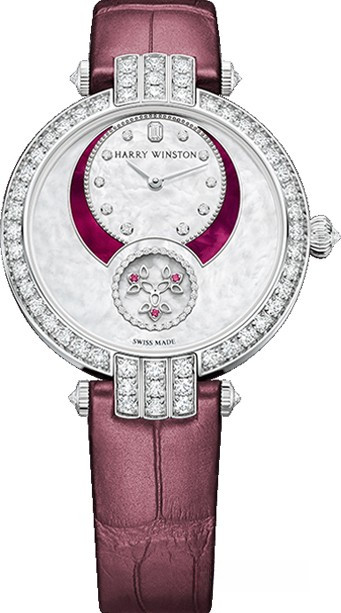 Часы Harry Winston Premier Diamond Second Automatic 36 mm выпущены в корпусе из белого золота 18к, размером 36 мм и водонепроницаемостью 30 м. Внутри корпуса установлен автоматический механизм, Калибр HW2201. На белом жемчужном с бордовым и белыми бриллиантами циферблате отображаются часы, минуты, секунды. Часы комплектуются ремешком из кожи аллигатора с вставкой из белого золота 18к. Корпус инкрустирован белыми бриллиантами.