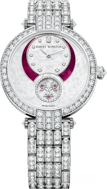 Часы Harry Winston Premier Diamond Second Automatic 36 mm выпущены в корпусе из белого золота 18к, размером 36 мм и водонепроницаемостью 30 м. Внутри корпуса установлен автоматический механизм, Калибр HW2201. На белом жемчужном с бордовым и белыми бриллиантами циферблате отображаются часы, минуты, секунды. Часы комплектуются браслетом из белого золота 18к, инкрустированным белыми бриллиантами. Корпус инкрустирован белыми бриллиантами.