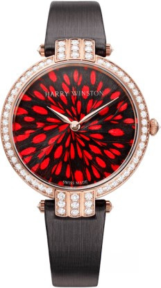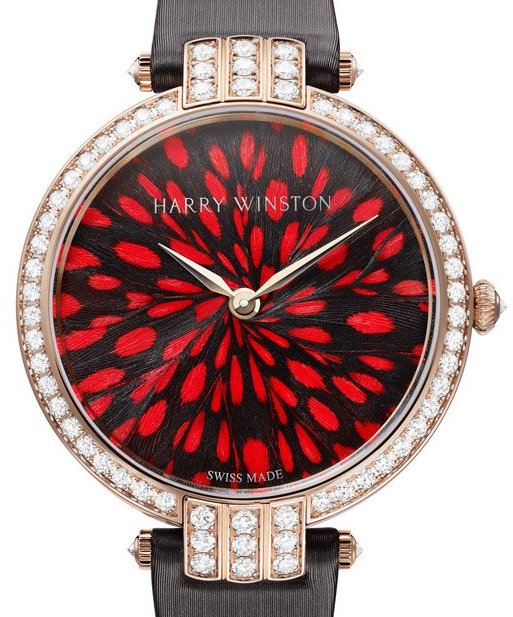 Часы Harry Winston Premier Feathers выпущены в корпусе из розового золота 18к, размером 36 мм и водонепроницаемостью 30 м. Внутри корпуса установлен кварцевый механизм, Калибр HW1042. На черном с красным циферблате отображаются часы, минуты. Часы комплектуются сатиновым ремешком с вставкой из розового золота 18к. Корпус инкрустирован белыми бриллиантами.