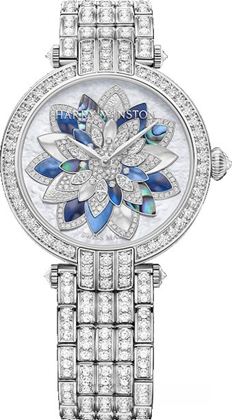Часы Harry Winston Premier Lotus Automatic 31mm изготовлены в корпусе из белого золота 18к размером 31 мм и водонепроницаемостью 30 метров. На белом с голубым жемчужном циферблате с белыми бриллиантами отображаются часы, минуты. Внутри корпуса установлен автоматический механизм HW2010. Часы комплектуются браслетом из белого золота 18к, инкрустированным белыми бриллиантами. Корпус инкрустирован белыми бриллиантами.