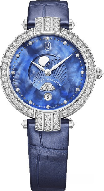 Часы Harry Winston Premier Moon Phase 36 mm выпущены в корпусе из белого золота 18к, размером 36 м и водонепроницаемостью 30 м. Внутри корпуса установлен кварцевый механизм, Калибр HW5201. На синем жемчужном с белыми бриллиантами циферблате отображаются часы, минуты, дата, фаза луны. Часы комплектуются ремешком из кожи аллигатора с вставкой из белого золота 18к. Корпус инкрустирован белыми бриллиантами.