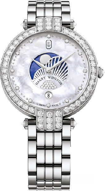 Часы Harry Winston Premier Moon Phase 36 mm выпущены в корпусе из белого золота 18к, размером 36 м и водонепроницаемостью 30 м. Внутри корпуса установлен кварцевый механизм, Калибр HW5201. На белом жемчужном с белыми бриллиантами циферблате отображаются часы, минуты, дата, фаза луны. Часы комплектуются браслетом из белого золота 18к. Корпус инкрустирован белыми бриллиантами.