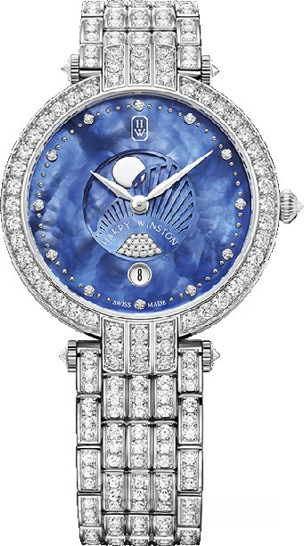 Часы Harry Winston Premier Moon Phase 36 mm выпущены в корпусе из белого золота 18к, размером 36 м и водонепроницаемостью 30 м. Внутри корпуса установлен кварцевый механизм, Калибр HW5201. На синем жемчужном с белыми бриллиантами циферблате отображаются часы, минуты, дата, фаза луны. Часы комплектуются браслетом из белого золота 18к, инкрустированным белыми бриллиантами. Корпус инкрустирован белыми бриллиантами.