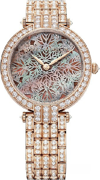 Часы Premier Lace 36 mm имеют два знаковых узора, символизирующих абсолютную женственность своим собственным уникальным способом: кружево – драгоценность и тонкость, символизм вечного времени; и перламутр – символ нежности и чистоты. Часы увлекательные и таинственные, с мерцающим белым перламутровым кружевом на коричневом жемчужном циферблате. Элегантный узор выполнен из перламутра толщиной всего в 0,15 мм. Ремесленники мануфактуры создают настоящие арабески из света и тени. Корпус часов изготовлен из розового золота 18к. Корпус инкрустирован белыми бриллиантами. В часы помещен автоматический Калибр HW2008 с механизмом индикации часов и минут. Браслет из розового золота 18к, инкрустированный белыми бриллиантами.