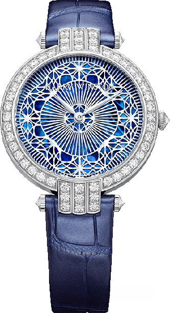 Часы Premier Lace 36 mm имеют два знаковых узора, символизирующих абсолютную женственность своим собственным уникальным способом: кружево – драгоценность и тонкость, символизм вечного времени; и перламутр – символ нежности и чистоты. Часы увлекательные и таинственные, с мерцающим белым перламутровым кружевом на синем жемчужном циферблате. Элегантный узор выполнен из перламутра толщиной всего в 0,15 мм. Ремесленники мануфактуры создают настоящие арабески из света и тени. Корпус часов изготовлен из белого золота 18к. Корпус инкрустирован белыми бриллиантами. В часы помещен автоматический Калибр HW2008 с механизмом индикации часов и минут. Ремешок из кожи аллигатора с вставкой из белого золота 18к.