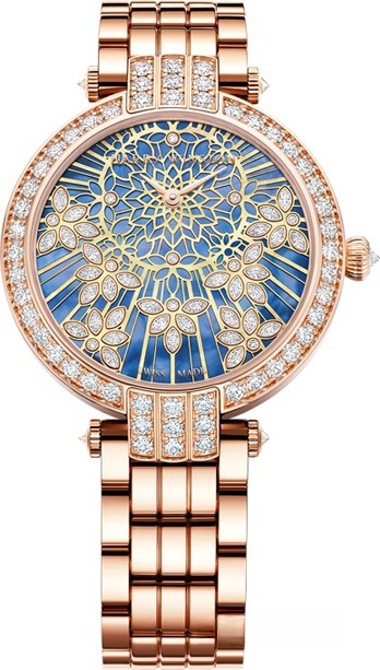 Часы Premier Lace 36 mm имеют два знаковых узора, символизирующих абсолютную женственность своим собственным уникальным способом: кружево – драгоценность и тонкость, символизм вечного времени; и перламутр – символ нежности и чистоты. Часы увлекательные и таинственные, с мерцающим золотым кружевом на синем жемчужном циферблате, украшенным белыми бриллиантами. Элегантный узор выполнен из розового золота толщиной всего в 0,15 мм. Ремесленники мануфактуры создают настоящие арабески из света и тени. Корпус часов изготовлен из розового золота 18к. Корпус инкрустирован белыми бриллиантами. В часы помещен автоматический Калибр HW2014 с механизмом индикации часов и минут. Браслет из розового золота 18к.